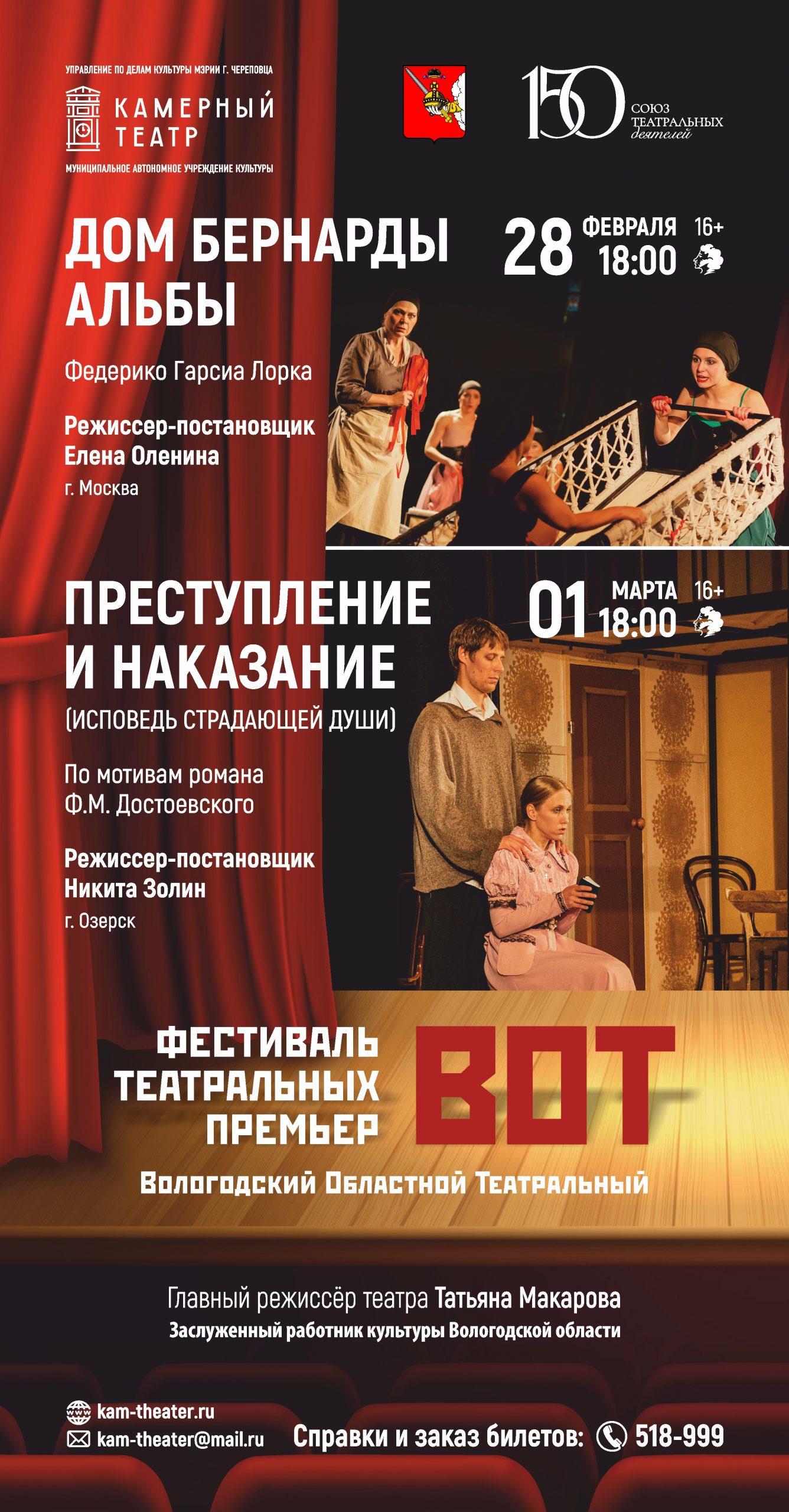 Череповецкий Камерный театр представит на фестивале два спектакля: «Дом Бернарды Альбы» по пьесе Федерико Гарсиа Лорки (режиссёр Елена Оленина, г. Москва, показ 28 февраля в 18.00) и «Преступление и наказание» по мотивам одноимённого романа Ф.М. Достоевского (режиссёр Никита Золин, г. Озёрск, показ 01 марта в 18.00).