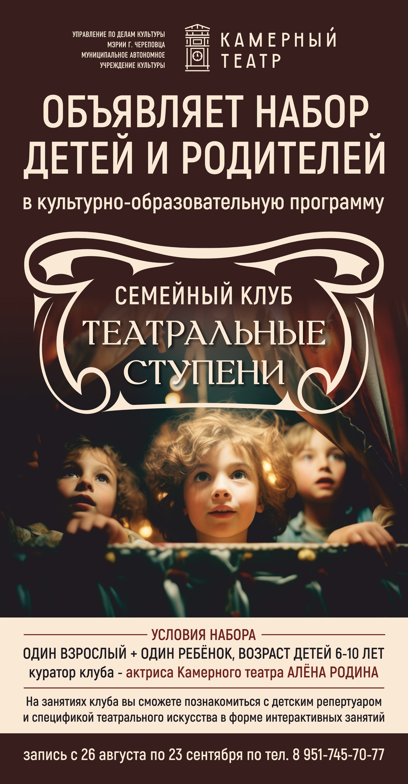 С октября 2019 г. в Камерном театре начнет свою работу Семейный клуб «Театральные ступени». Куратор семейной группы клуба — актриса театра Алёна Родина.