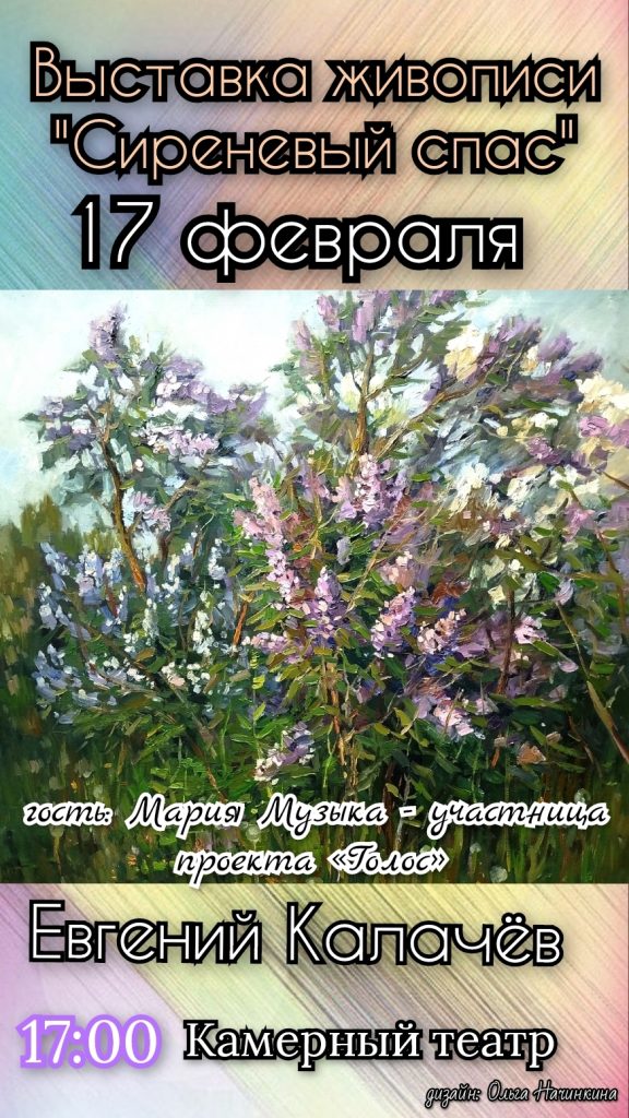 16.02.2026 Выставка Евгения Калачева «Сиреневый спас» 14.01.2026 Выставка Натальи Поликарповой «Поэзия пастели» 18.12.2025 Выставка творческих работ учащихся детской художественной школы №1 «Зимние истории» 07.11.2025 Выставка художника Антона Иоганна «Для тебя» 07.10.2025 Персональная выставка Екатерины Веселковой 01.09.2025 Выставка Екатерины Крыловой «Счастье в коробках» 04.06.2025 Выставка работ выпускников ДХШ № 1 «Чтобы ярче светили таланты» 05.05.2025 Конкурс детских рисунков «Эхо войны и память сердца» 11.04.2025 Выставка череповецких художников членов Северянинского общества 18.03.2025 Выставка к Международному дню театра «Весна. Театр». Коты» 21.01.2025 Персональная выставка картин Николая Филатова «Маски-краски» 20.12.2024 Выставка работ учащихся детской художественной школы №1 «Свет Рождества» 18.12.2024 Выставка игрушек Валентины Багулиной «TEDDY MAMA» 04.12.2024 Выставка работ к юбилею детской художественной школы «Учитель и ученик» 14.11.2024 Выставка памяти художника Юрия Ивановича Модестова 15.10.2024 Выставка Евгения Калачева «Свет миров» 05.09.2024 Выставка «Поэзия городского пейзажа» 05.06.2024 Фотовыставка «Мир, в котором мы живём» 31.05.2024 Чтобы ярче светили таланты 16.04.2024 Выставка «Руками женщины» 19.03.2024 Выставка «Краски театра» 02.03.2024 Выставка «Я природой живу и дышу» 07.02.2024 Персональная выставка Екатерины Веселковой 16.01.2024 Выставка авторской эмали «Театр Огня» 15.12.2023 Выставка работ учащихся детской художественной школы «Новогодний карнавал» 18.11.2023 Выставка «Нам — 30!» 26.10.2023 Выставка Натальи Ухановой «Следуя за вдохновением» 26.09.2023 Проект «Мама Катя» Екатерины Крыловой 18.04.2023 Художники театра 21.03.2023 Весь мир — театр 20.02.2023 Времена года 18.01.2023 Грани творчества 16.12.2022 Выставка работ учащихся детской художественной школы №1 «Рождества волшебные мгновения» 21.11.2022 Персональная выставка Аркадия Полякова 27.10.2022 Выставка Антона Иоганна «Радость пленэра» 14.10.2022 Выставка работ учащихся детской художественной школы №1 «Жизнь и творчество В.В. Верещагина» 14.09.2022 Персональная выставка Галины Шагиновой 07.06.2022 Выставка череповецких художников «Уездный город Череповец» 25.05.2022 Выставка работ учащихся детской художественной школы №1 «Чтобы ярче светили таланты…» 05.05.2022 «Здоровые города глазами детей» 14.04.2022 Выставка Любови Борисовой «Череповец — порт пяти морей» 04.03.2022 Выставка ко Дню театра «По обе стороны кулис..» 22.02.2022 Выставка Екатерины Крыловой «Обо всём…» 16.12.2021 Выставка работ учащиеся художественных школ «Свет Рождества» 12.01.2022 Выставка череповецких художников «От Севера до Юга» 16.11.2021 Персональная выставка Марии Золотовой «Отражения» 18.10.2021 Персональная выставка работ Николая Филатова «Премьера» 16.09.2021 Александр Сухин. «Причины неизлечимой болезни» 22.03.2021 Выставка работ молодых художников «Живое дело. Избранное» 04.03.2021 Выставка живописных работ Евгения Калачёва «По местам юности Игоря Северянина» 22.01.2021 Выставка «И родина моя передо мною» 08.12.2020 Вторая Всероссийская передвижная выставка «Реалисты России» 09.11.2020 Выставка акварели «Города мира» 02.11.2020 Выставка фотографий танцевального коллектива «Ступени» 27.09.2020 По обе стороны кулис. Юбилейная выставка работ Марины Брауловой 16.01.2020 Возрождение православных храмов города Устюжны: выставка работ студентов института им. И.Е. Репина (Санкт-Петербург) 10.12.2019 Выставка «Свет Рождества» 22.11.2019 Выставка работ юных художников Черепове