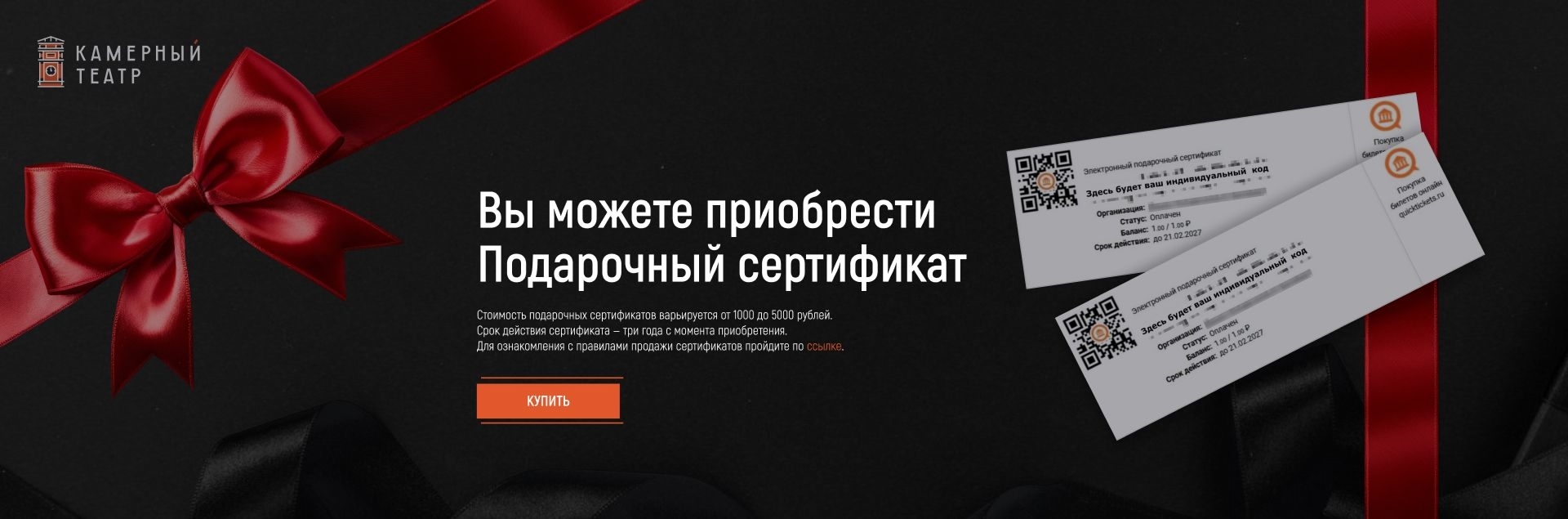 По многочисленным просьбам зрителей с сегодняшнего дня мы начинаем реализацию электронных ПОДАРОЧНЫХ СЕРТИФИКАТОВ на спектакли и концерты, продажа билетов на которые осуществляется на сайте продаж Камерного театра! (кнопка «Подарочные сертификаты» вверху справа на сайте продаж).