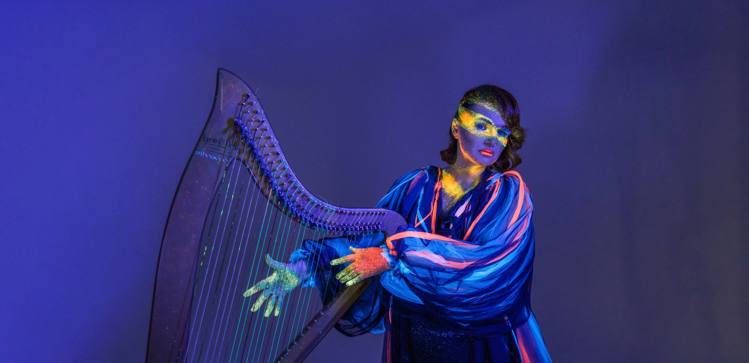 Медитативная музыка электроарфы сочетается с видеоинсталляцией, переходящей в темноту, из которой постепенно при помощи ультрафиолета и специального грима появляется образ арфистки.