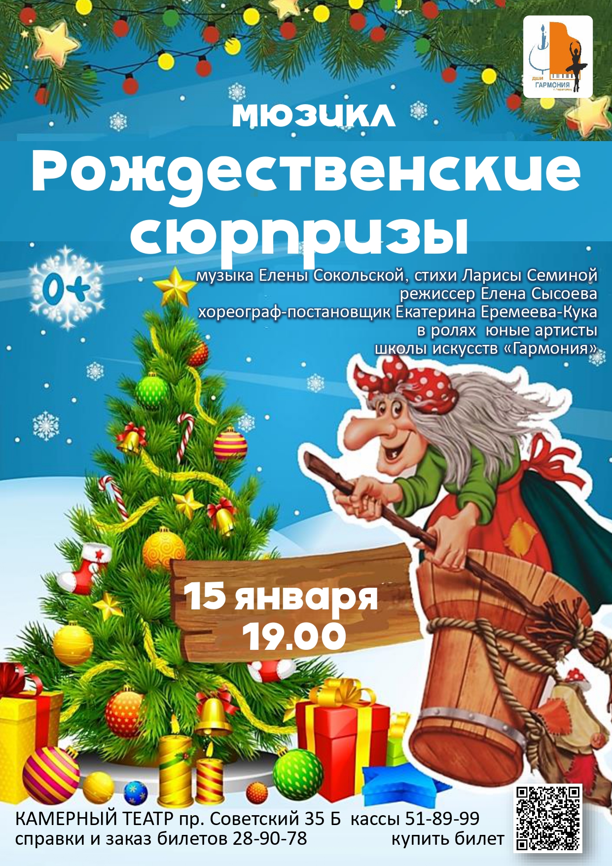 Впервые учащиеся Детской школы искусств «Гармония» представят мюзикл «Рождественские сюрпризы». Музыка написана популярным композитором Еленой Сокольской, стихотворный сценарий создан Ларисой Семиной. Волшебный рождественский сюжет будет интересен не только детям, но и взрослыми. Главные герои – Никита и Даша - попадут в интересную историю вместе со сказочными персонажами: Снежной Королевой, Бабой-Ягой, Золушкой, Буратино, Красной Шапочкой, Белоснежкой, Пеппи Длинныйчулок и др. Режиссер мюзикла - руководитель вокального ансамбля «Ассорти», победитель фестиваля-конкурса вокального творчества «Гол*c Череповца», старший преподаватель отделения эстрадного пения Детской школы искусств «Гармония» Елена Сысоева.