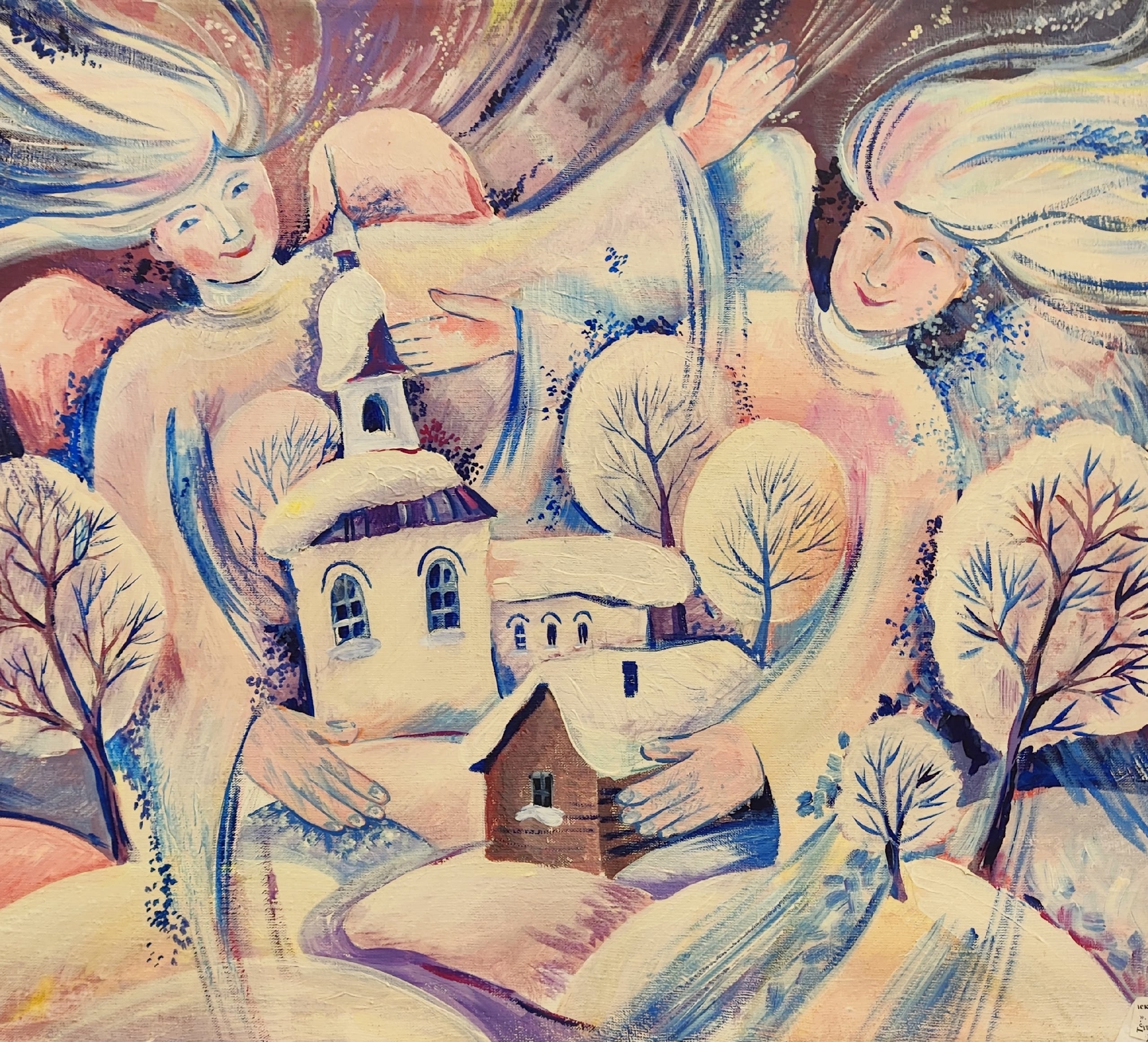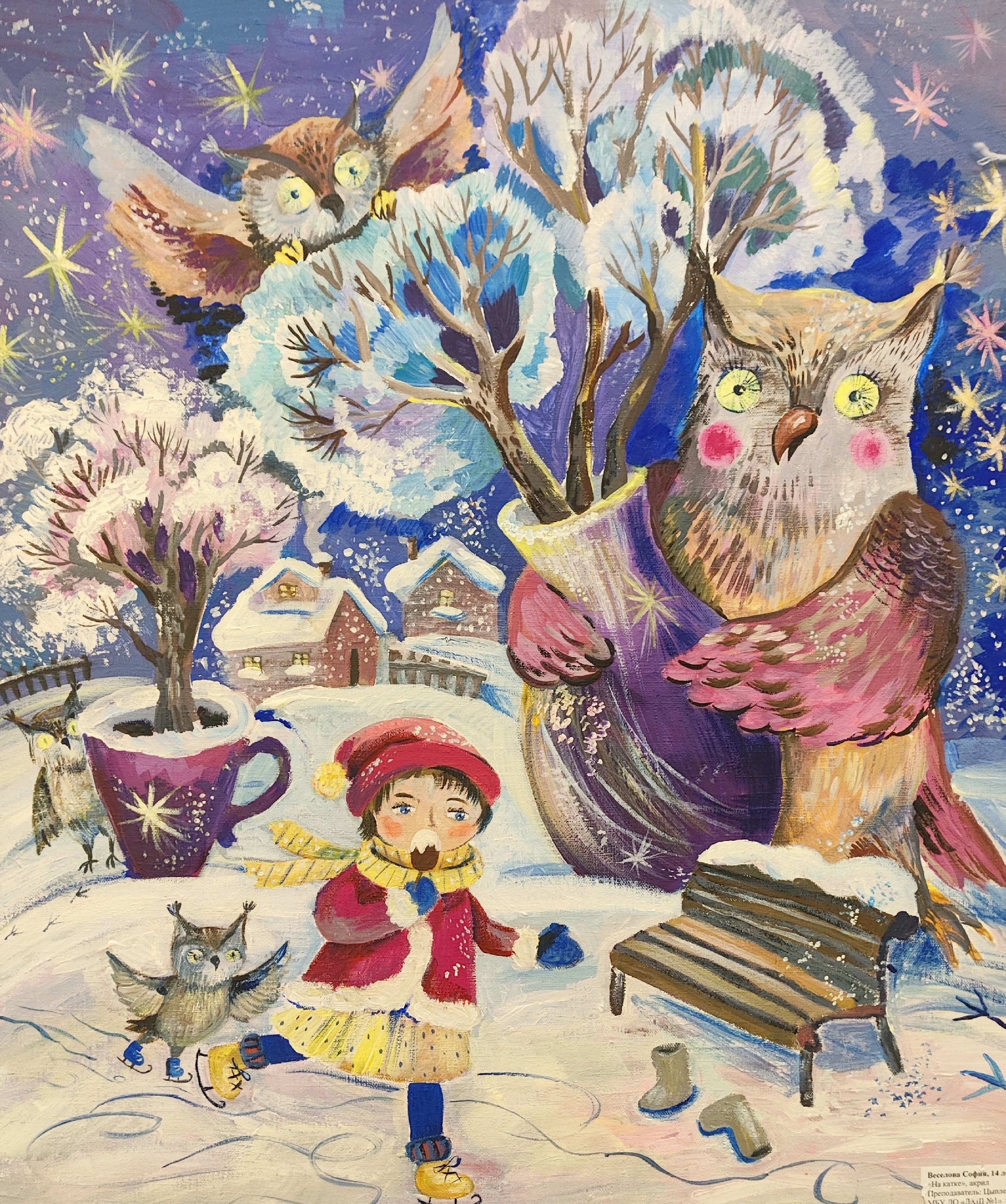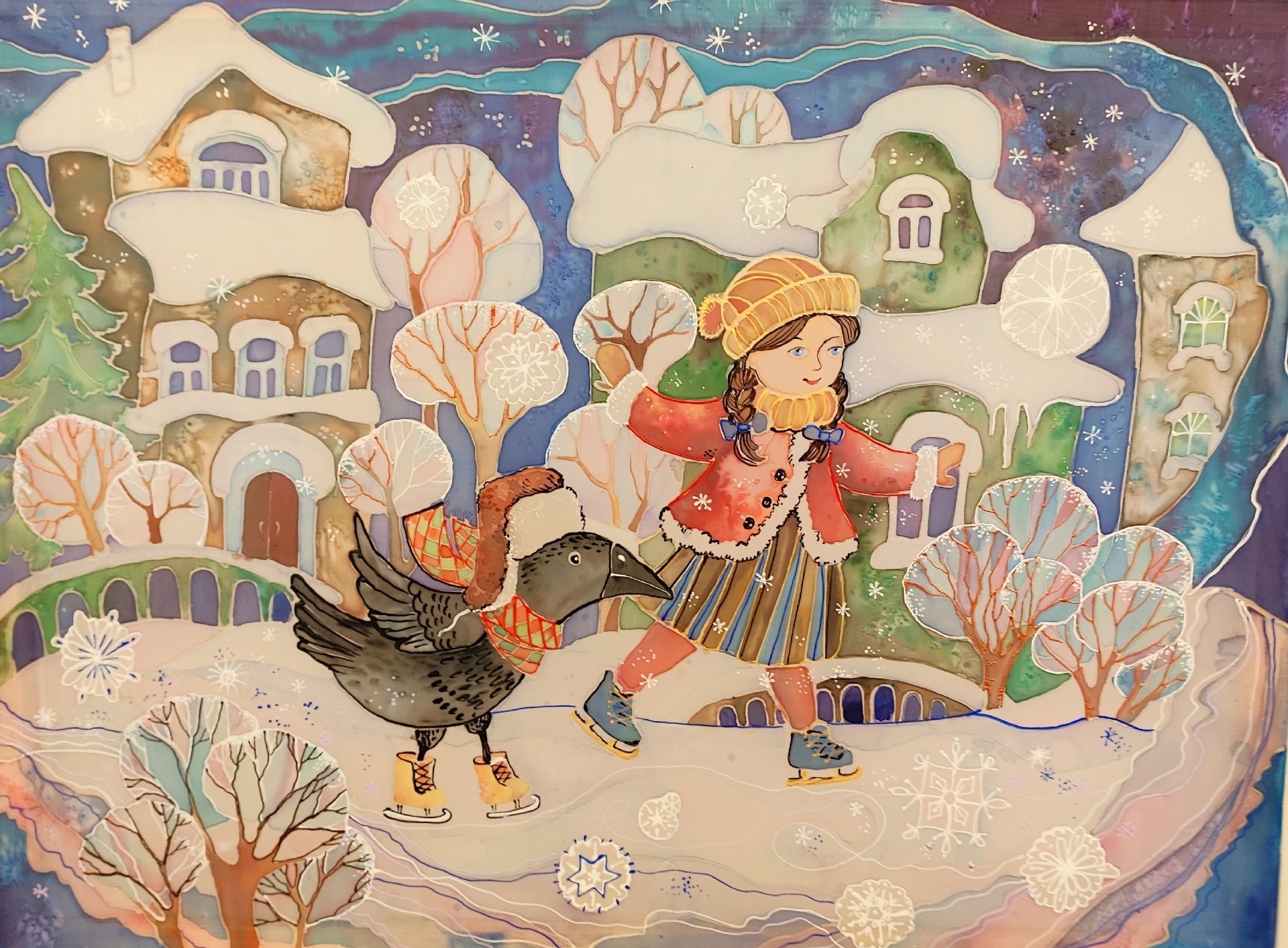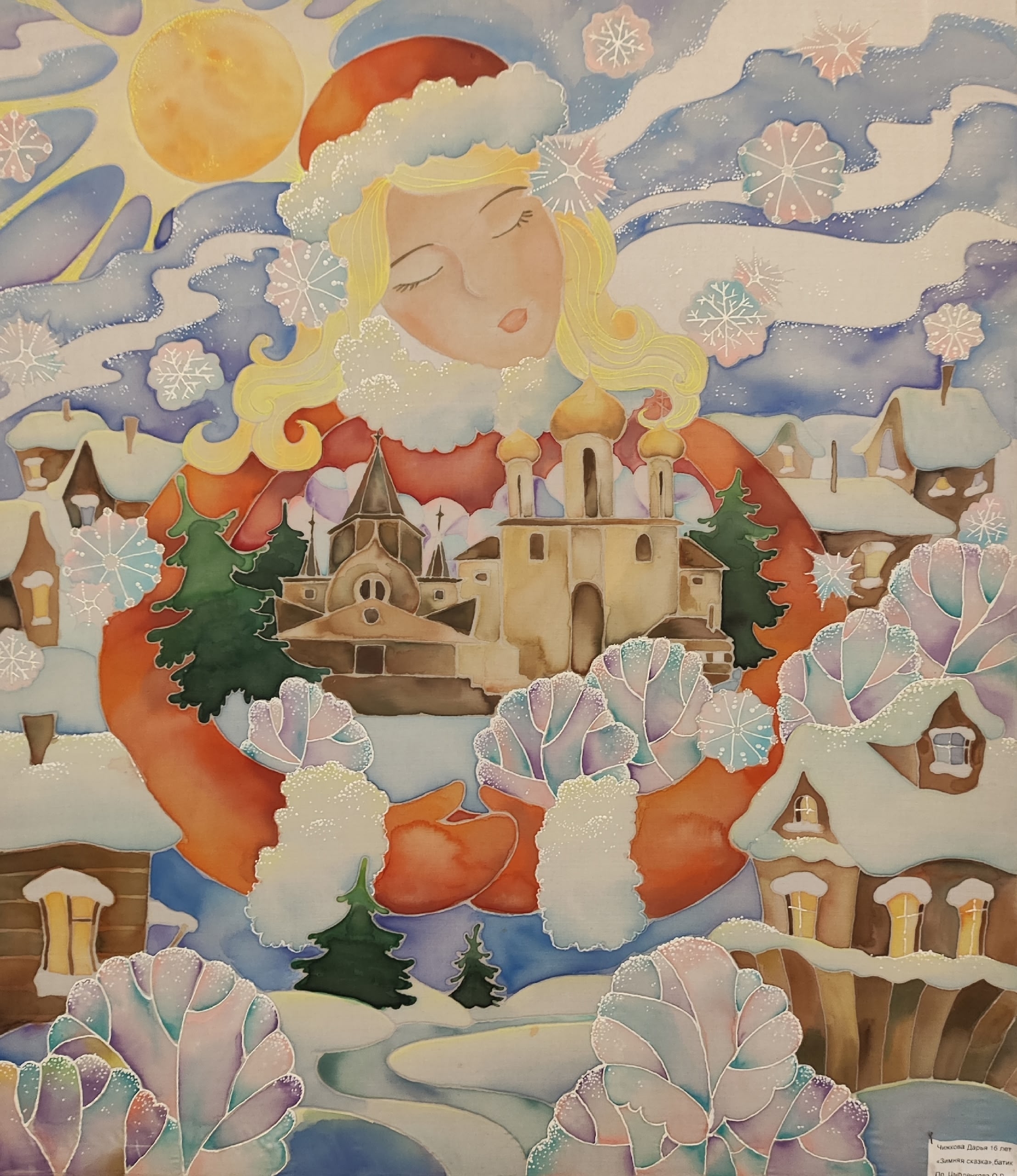 Работы выполнены в различных техниках: здесь и валяние, и коллаж, и батик, и акриловая техника, и сюжетные композиции, и графика. Все работы объединяются основными сюжетами: зимний город Череповец, Рождество, иллюстрации народных и авторских сказок.